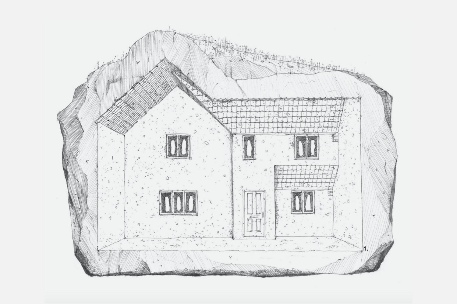 Future Fossil features a life-size section of a typical Oxley Park house. Rising out of the ground as if newly excavated from the future, the house has been fossilized through the passing of time, exposed to climatic disaster and environmental change.