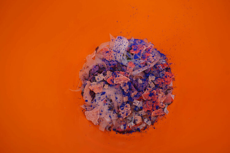 On closer inspection, the interior walls, ceilings and floors of the house are flecked with an array of brightly coloured man-made materials, which have been subsumed into the sculpture, echoing the processes by which plastics are now polluting every corner of the planet.